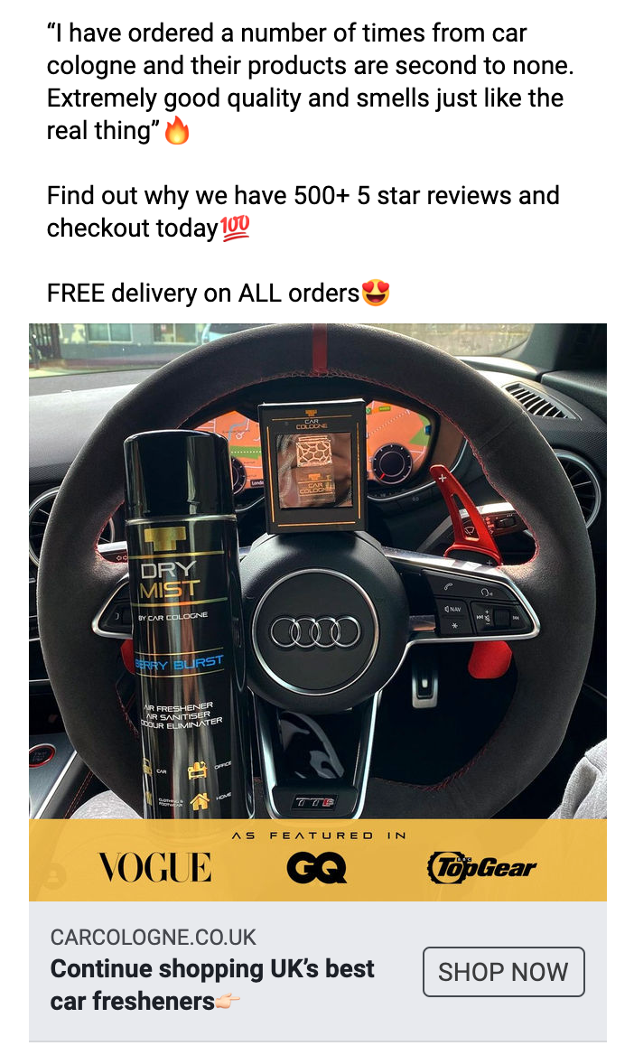 This UK-based car fragrance retailer joined us in January 2020. We have worked together for two years now and scaled this business to achieve over £1 million in revenue in 2020/2021. Their premium car fragrance products are loved by influencers and celebrities, as well as 10,000s of customers generated through our paid advertising campaigns.