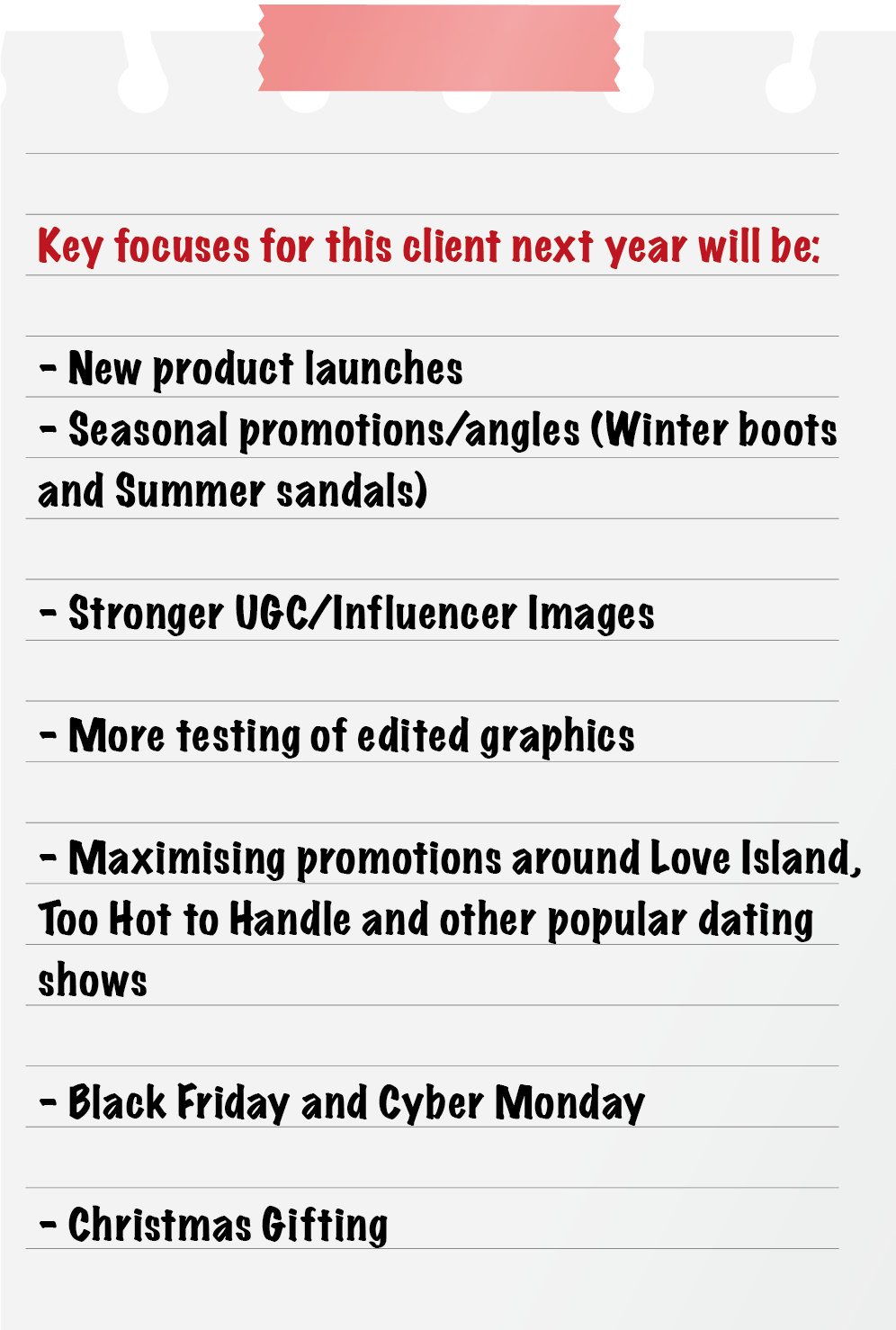 This includes new and out-of-the-box audiences paired with brand-new creative angles and a results-led plan for upping budgets, optimising existing performance and achieving even better metrics.
