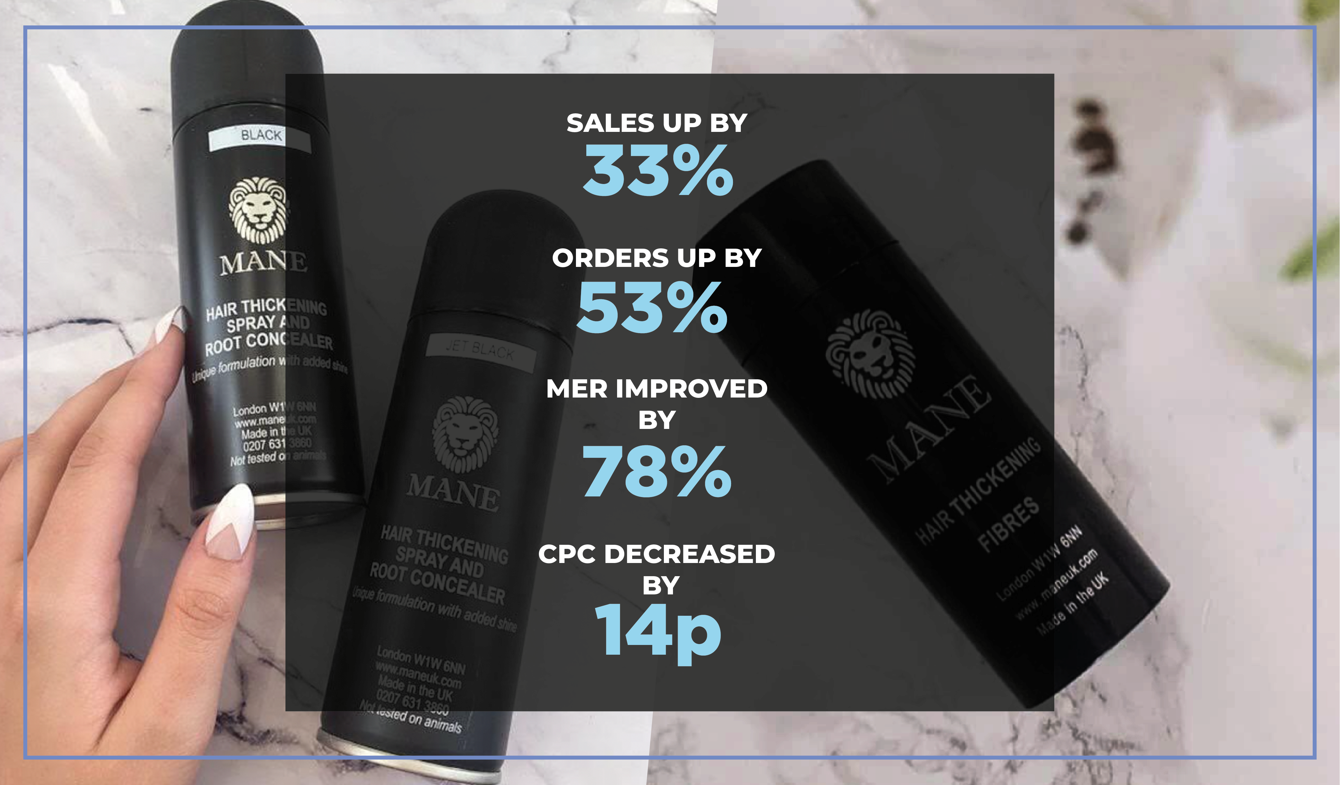From onboarding, the aim was to ultimately gain Mane UK a dedicated audience, with the intent of customers repurchasing routinely. To make this goal achievable, our dedicated team of Account Managers consistently optimised existing data from previous website engagement & campaigns, which lead to a rise in sales by 33%, CPC decreased by 14p, overall orders by 53%, and a notable improvement in MER by 78%. This was accomplished through continuous testing, covering all areas of potential audiences using TOF, MOF & BOF strategies - therefore, any potential customer would see content specifically catered to their online behaviours, interests & gender/age specifics.