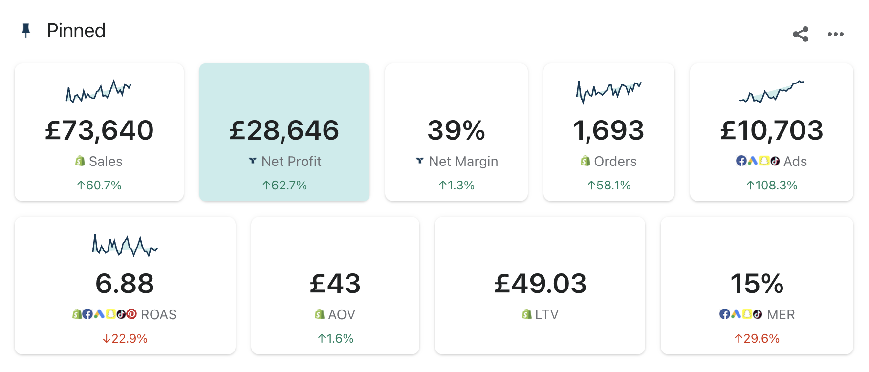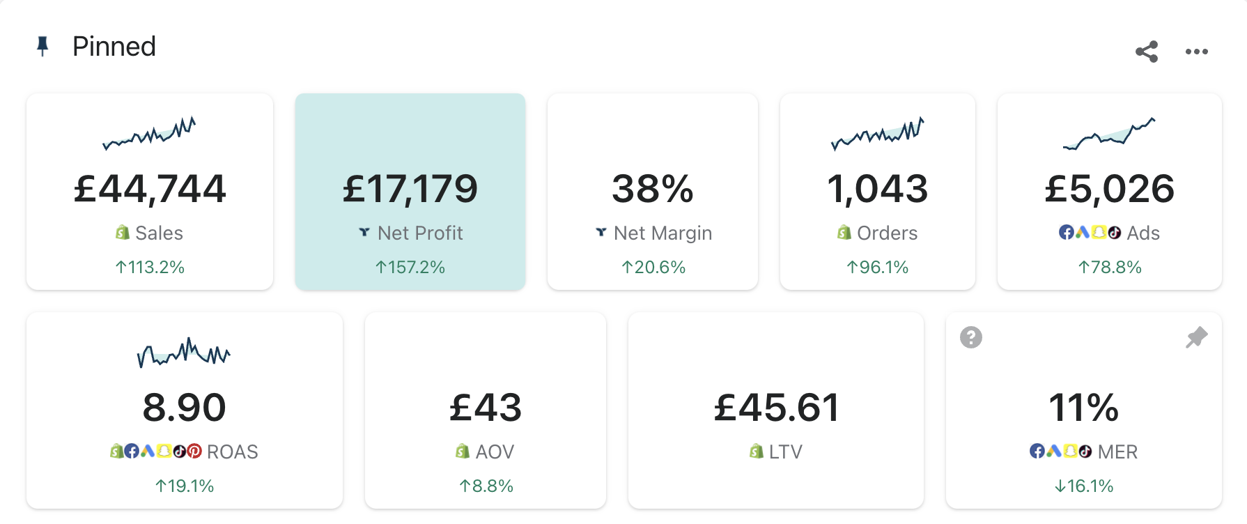 By the end of the month, we'd upped our spend to £5,024.30 and generated 449 sales at a 3.38 ROAS on Facebook alone. Once again, adding in our other marketing channels, we finished with total sales of £44,744 at a blended ROAS of 8.90.